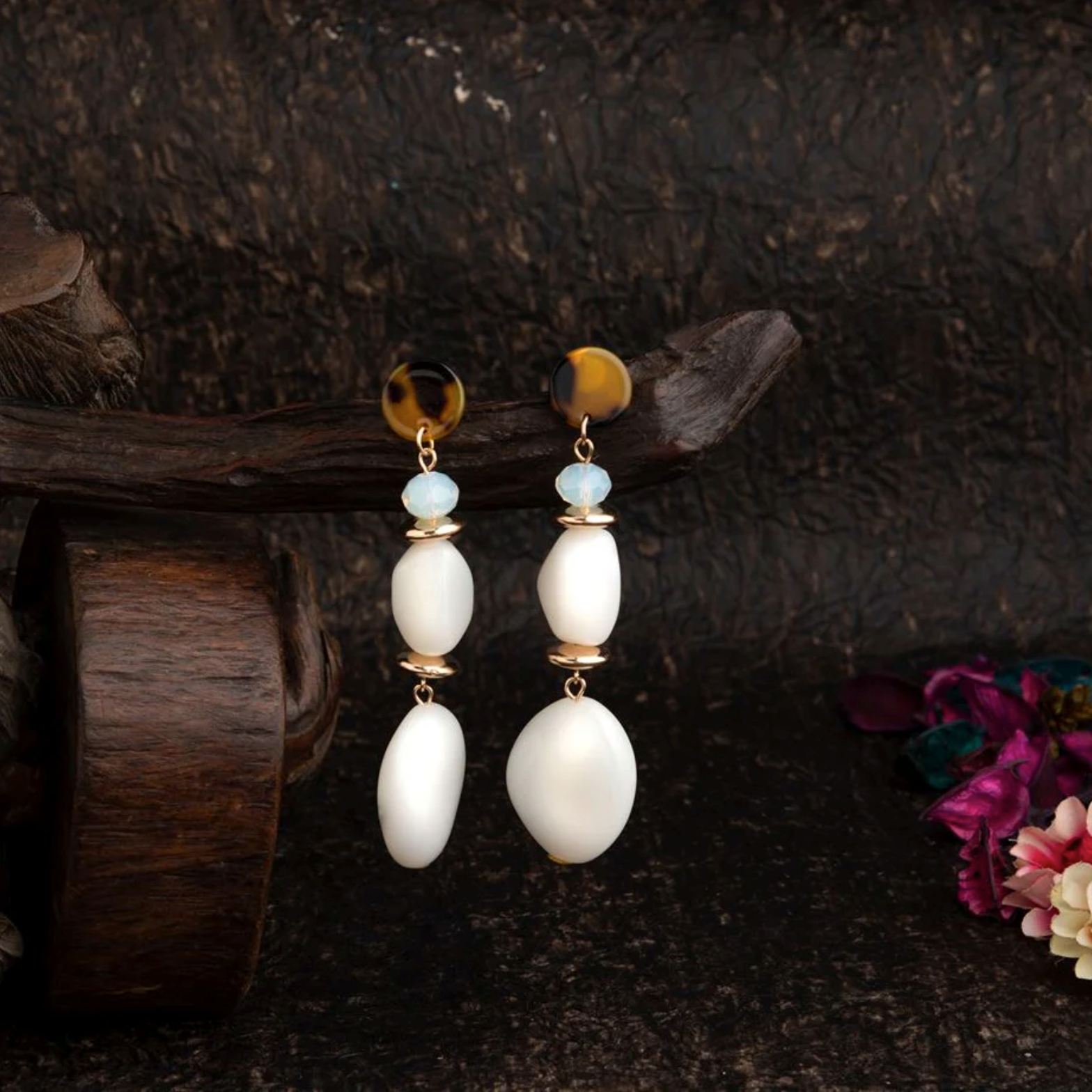 Elevate your look with these chic dangle earrings. Featuring a classic tortoiseshell stud, they drop down to two polished, milky-white stones separated by delicate gold-toned accents for a touch of modern sophistication.